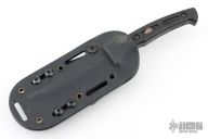 This Massad Ayoob "Razorback" by Masters of Defense has a black coated tanto partially serrated blade with fullers, .177" blade stock and .637" blade depth, hidden tang construction. The handle is black coated aluminum. Comes with a black kydex sheath with belt loops. Has a couple light scuffs and scratches, great condition otherwise.