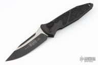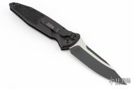 This Socom Elite Auto from Microtech has two toned drop point blade with notched thumbrest. The handle has a black aluminum frame with non-slip rubber inserts and a tip down stainless steel clip, black hardware. Dated 12/2021 and S/N 7456. Includes original box and paperwork. Excellent Condition.