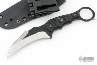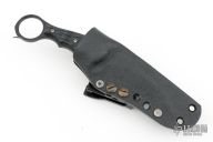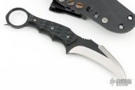 This karambit by RJ Martin by features a hawkbill blade with sharpened top edge, notched thumbrest, .171" blade stock and 1.179" blade depth, full tang construction, with black textured flats, and textured G10 scales. .999" finger hole. Comes with a kydex sheath and belt clip. Has a couple scuffs and scratches, excellent condition otherwise.