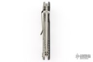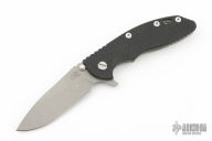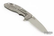 This XM-18 by Rick Hinderer features a working finished blade with notched thumbrest and flipper. The handle has a working finished titanium frame with black G-10 scale, and a tip up or down reversible titanium clip, pivot, and filler tab, lanyard hole at the butt. Comes with original box and extra hardware. Excellent condition.
