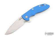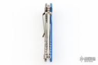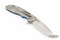 This XM-18 3.5" flipper by Rick Hinderer features a stonewashed blade with notched thumbrest and flipper. The handle has a stonewash titanium frame with a blue G-10 scale, a tip up or down reversible titanium clip and filler tab, lanyard hole at the butt. Comes with original box and extra hardware. Excellent condition.