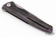 This Hudson Flipper by Alexander Cheburkov features a San Mai Damascus blade with notched flipper. The handle has a blackened titanium frame with purple ano peaking through, matching backspacer and tip up clip with hidden screws. Comes with original box and COA. Excellent condition.