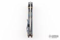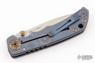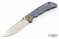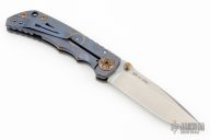 This Harsey framelock folder by Spartan Blades features a stonewashed drop point blade with dual thumbstuds and a notched thumbrest. The handle has an anodized titanium frame with a laser engraving a tip up titanium clip and filler tab. Has nice detent, lockup, and blade seating. Comes with original box. Excellent condition.