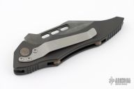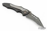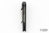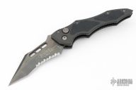 This Vector side opening automatic by Microtech Knives features a black tanto recurve blade with partial serrations. The handle has a black aluminum frame with non-slip inserts, tip down bead blasted stainless steel clip. Bronze color standoffs. Dated 05/2002 and #2351. Has some light scuffs and scratches, great condition otherwise.