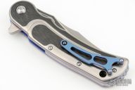 This Citadel linerlock flipper by Todd Begg features a mirror polished clip point blade with carbon fiber inlays.  The handle features a satin finished titanium frame with carbon fiber inlays over anodized titanium liners and a matching tip up pocket clip.  Titanium Backspacer.  Includes the original box and padded case. Excellent condition.