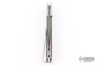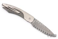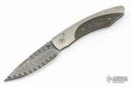 This folder by William Henry features a bead blasted  titanium frame with carbon fiber inlays. Spinel inlays in thumb stud and push button. The push button releases the lock and allows you to close the knife. The drop point blade is San Mai Wave Damascus with VG-10 core. Includes the original box and COA. Excellent condition.