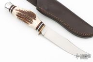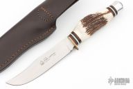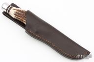 This Pathfinder by Puma Knives features a satin finished blade with false top edge, .139" blade stock and 1.010" blade depth, hidden tang construction. The handle has a brass guard with stag scales. Includes original leather sheath. Has scuffs, scratches, and patina. Great condition for it's age.