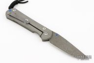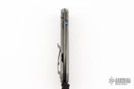 This Large Sebenza by Chris Reeve features a Chad Nichols "Rain Drop" pattern stainless Damascus blade with single anodized thumbstud. The frame is bead blasted titanium with tip up clip. Includes the original box, papers and sheath.  Excellent condition.