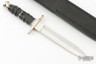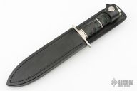 This custom 976 Dagger by Buck Knives features a mirror polish finished blade with false top edge, .169" blade stock and .995" blade depth, hidden tang construction. The handle has a nickel silver guard, buttcap, and a black buffalo horn grip. Comes with black leather sheath. Excellent condition. This knife is a 100 year anniversary knife. #0887