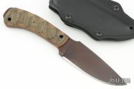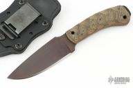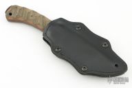 This Winkler II Woodsman features a black blade with notched thumbrest, .212" blade stock and 1.419" blade depth, full tang construction. The handle has green and tan canvas micarta scales. Comes with a black leather sheath and original papers. Has a couple light scuffs, otherwise excellent condition.
