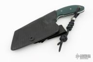 This knife by David Lancaster Clark features a satin finished blade with .115" blade stock and 1.128" blade depth, full tang construction. The handle has G-10 scales. Comes with a kydex sheath. New from maker.