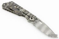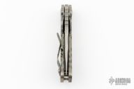 This JVA by Mick Strider is larger than a PT, but smaller than an SNG. It features a ghost striped blade with notched thumbrest and thumbhole. The handle has a Disruptive Strider Stripe finished titanium frame with matching tip up clip. New from maker at the 2024 Blade Show.