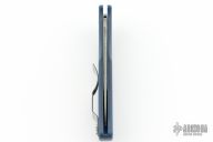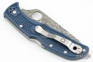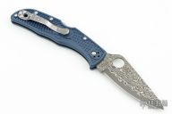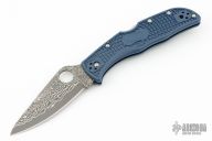 This Endela by Spyderco features a VG-10 core San Mai Damascus blade with thumbhole and notched thumbrest. The handle has blue FRN scales with stainless steel subframe and 4-way reversible clip. Comes with original box and papers. New condition.