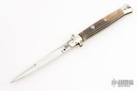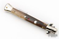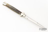 This Picklock auto by Latama features a mirror polished bayonet ground blade with a false top edge. Nickle silver guard and rear bolster and Buffalo horn scales, brass liners and stainless steel backspacer. Nice function, strong firing and lock up. Excellent condition.