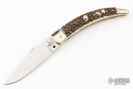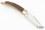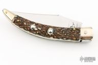 This Catalanas Auto Picklock by Renzo Passcotto features a mirror finished blade, stag scales, brass liners and nickel silver bolsters. This knife was made in 2023 and is #12/55. Excellent Condition.