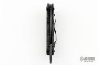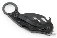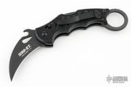This 599-XT Karambit from Fox Knives Military Division features a black coated karambit style blade with thumb hole, wave feature and flipper. The handle has a machined black G10 scales over black steel liners and backspacer. Black coated 1-inch finger hole in pommel. Reversible tip up clip. Has carbide spike in the closed position. Includes tool and extra clip. Excellent condition.