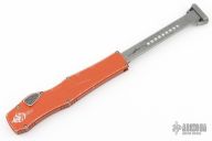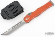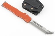 This Halo VI by Microtech Knives features an Apocalyptic finished Hellhound blade with satin flats and notched thumbrest. The handle has a distressed orange aluminum frame and Apocalyptic finished titanium charging handle. No safety. Comes with a kydex sheath with belt clip, papers, and (wrong halo vi hellhound) box. Dated 12/2018 and s/n 009. Excellent condition.