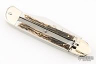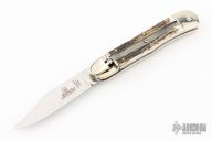 This leverlock auto by Hubertus features a mirror polished blade, nickel silver double bolsters, stag scales, nickel silver liners and brass pins. Opens with a nice snap. Very fast opening. Comes with original box and papers. New condition.