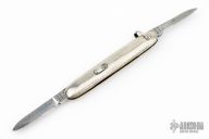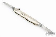 This double auto by Flylock Knife company features two blades both with their own push button. The handle has a nickel steel frame and steel backspacer. Has some scuffs/scratches otherwise good condition for its age.