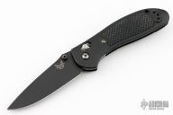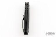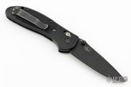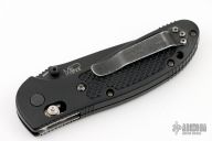 This axis-lock was designed by Mel Pardue and made by Benchmade features a black blade with partial serrations, a notched thumbrest and dual thumb studs. The handle is composed of black FRN and a black steel tip up pocket clip. Has a couple light scuffs, clip is worn, great condition otherwise.