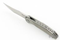 The Tiger is a meticulously designed in-house Reate masterpiece that seamlessly blends precision and broad versatility into a very intriguing package. Boasting an open length of 8.75 inches, this knife exudes a commanding presence with a 3.5-inch Bohler M390 stainless steel blade, hardened to 60-61HRC for unparalleled cutting prowess. The 0.165-inch thick compound ground recurve blade, elegantly housed within a 5-inch closed length, strikes the perfect balance between robustness and finesse. Its 6AL4V titanium handle is heavily internally milled, yet the knife still possesses a reassuring weight of 6.77 ounces, ensuring a solid grip, while the knife's ceramic bearings and next-level tolerances guarantee a flawlessly smooth flipping action. The Reate Tiger redefines the boundaries of what a folding knife can achieve, offering not only a heavy, reassuring build but also a level of craftsmanship that sets it apart. With its incredible flipping action, this knife effortlessly transitions from everyday tasks to more demanding situations, showcasing its extreme versatility.