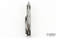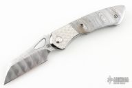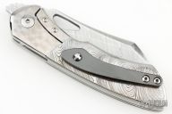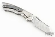 This Whippersnapper Bolsterlock from Olamic Cutlery features a polished Damasteel blade, thumbhole, notched thumbrest and front flipper. The titanium frame has jeweled titanium bolsters, Damasteel scales, Zirconium pocket clip is positioned for tip up carry, floating polish finished titanium backspacer. Blade is centered when closed and locks up with no play. Comes with maker's card with a serial number of 72/80 (One-Off) and dated 05/07/2024. Includes a padded zippered case and bead. Has some light spotting on the handle, Excellent condition otherwise.