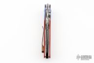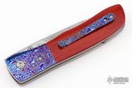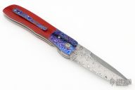 This linerlock by KC Gray features a spear point Damasteel blade with dual thumbstuds. The handle has timascus bolsters, micarta covers, titanium liners, timascus backspacer and a matching tip up clip. Nice detent, lockup and blade seating. Comes with zippered case. Excellent condition.