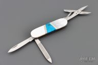 This Slipjoint by Camillus Knives was customized by Santa Fe Stoneworks. It features one blade, file and scissors. The handle has pearl/wood covers with nickel silver spacers, steel liners. Turquoise stone inlay.  Includes the original box. Excellent Condition.