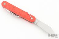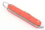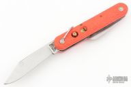 This knife by Camillus features a clip point blade. The handle has orange jigged scales, stainless steel liners and backspacer. Scratches are visible on the blade and handle otherwise the knife is in great condition. Has some blade play and some patina. Has Safety.