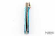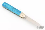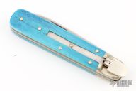This Boker Leverlock features a drop point blade. The handle is comprised of nickel silver bolsters and dyed bone scales over brass liners and stainless steel backspring. Has some light scratches, and patina, excellent condition otherwise.