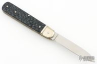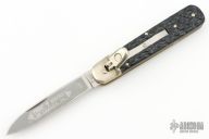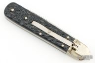 This Boker Leverlock features a drop point blade. The handle is comprised of nickel silver bolsters and jigged black scales over brass liners and stainless steel backspring. Has some scuffs, scratches, and patina. Great condition otherwise.