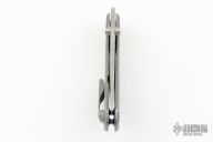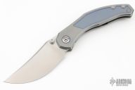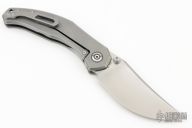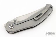 This Blava Knife features a bead blast finished clip point blade with a notched thumb rest and dual thumbstuds. The handle has a milled tumbled/anodized titanium frame and tip up titanium pocket clip. Anodized posts. Includes a COA and a padded velcro case and accessories.  S/N 132. Dated 04/24. Excellent condition.