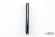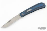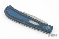 This Hunter by Richard Rogers features a bead blasted clip point blade with nail nick. The handle has textured and fluted black/blue covers with a stainless steel escutcheon and spring, and blasted titanium hardware. Has half-stop, flush in all positions. Comes with original box and COA dated March 2018. Excellent condition.