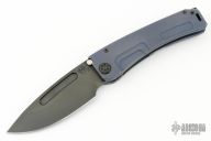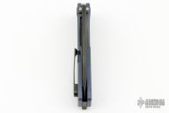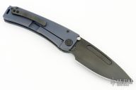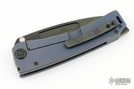 This Marauder from Medford Knife and Tool features a black PVD finished tanto blade with fullers. The handle has an anodized titanium frame over a PVD stainless steel backspacer and titanium tip up clip. Includes original box and hard case. Has black hardware. Has scuffs and scratches, great condition otherwise.