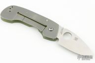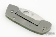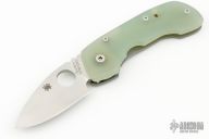 This Leafstorm by Spyderco is a Kevin Wilkins design, it features a satin finished blade with thumbhole and notched thumbrest. The handle has a Jade G-10 front scale and backspacer and a titanium lockside. Excellent condition.