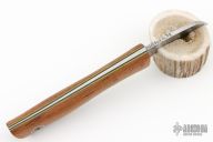 This Carver from Andy Roy of Fiddleback Forge features a wharncliffe blade with .135" blade stock and .893" blade depth, full tang construction. The handle has wood scales. Micarta and Stainless Steel lanyard tube on pommel. Excellent fit and finish. Excellent condition.