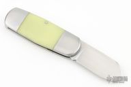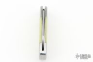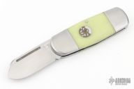 This Elephant Toe by Kirilov Customs features a satin finished blade with long pull. The handle stainless bolsters, front and rear, GITD resin covers, stainless liners, stainless steel spring and escutcheon. Nice blade seating, knife does not snap closed. Comes with a drawstring pouch, leather slip, and COA dated 2.24. Has a few light scratches, otherwise excellent condition.