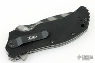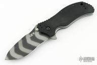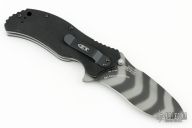 This 0350TS liner lock flipper is a Ken Onion design executed by Zero Tolerance and features a recurved spear-point blade with a tiger stripe finish, stainless steel liners and black G10 scales. It also features the Speed-safe assisted opening system. The black coated steel clip is 4 way adjustable. Perfect function. Includes original box. Excellent Condition.  #41199