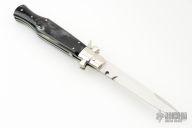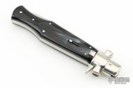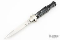 AGA Campolin 11" Blackwidow with Brazil Horn and mother-of-pearl inlays! This Campolin made automatic knife has solid nickel silver bolsters with maltese cross in the hilt. To close this one you use the lock back release at rear of the handle. This makes for very tight and stable construction and it's a bit more robust because of that. Has a mirror polished blade with fileworked spine. The nickel silver liners are fileworked and so is the stainless steel backspacer.   Excellent Condition.