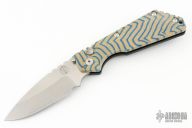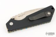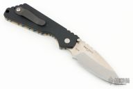 This Pro-Strider SNG by Pro-Tech and Strider Knives features a satin finsihed blade with notched thumbrest. The handle has a micarta scale, black aluminum frame with satin hardware and deep carry black stainless steel tip up clip.  There is black lip pearl inlaid into the push button. Comes with original box and papers. Excellent condition.