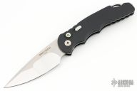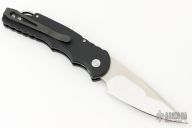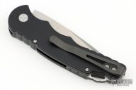 This Custom TR-5 by Pro-Tech Knives features a mirror polished compound hand ground blade. The handle has a black aluminum handle with an abalone inlaid push button, stainless steel backspacer with lanyard hole, tip up black stainless steel clip. Comes with original box and papers. Excellent condition.  #82