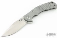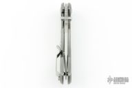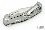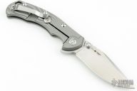 This Tom Stokes designed River Cat from Kizer Knives features a stonewashed clip point blade with swedge, dual thumb studs, notched thumb rest and flipper. The handle is comprised of bead blasted and machined titanium over polished barrel spacers. Stainless steel tip up clip can be mounted for right or left hand carry. Lanyard hole in pommel. Includes original box and papers. Excellent condition.