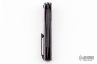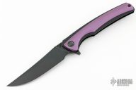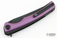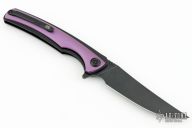 This model 704 by We Knife Company features a black finished upswept blade with notched thumbramp and flipper tab. The handle has a black titanium frame with purple scales. Titanium backspacer with lanyard bail, slot and hardware for a tip up clip. Comes with original box, papers, and zipper case. Excellent condition.