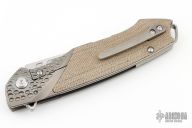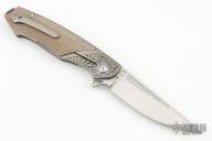 Kingsman V2 just like the awesome original but more belly and thinner behind the edge. Overall length 8.35", blade length 3.62" M390 blade @ 60-62 HRC, Titanium frame lock with titanium clip and back spacer. Smooth Action riding on ceramic caged bearings, weight only 3.9 ounces. All of this plus Tuya's excellent U.S based customer service & limited lifetime warranty. options for inlays are Micarta, Silver Carbon fiber, black marble Carbon fiber and just a few 26pc total dark Zirc-Timascus.