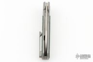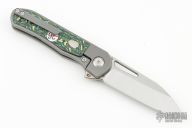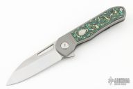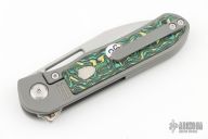 This knife features a satin finished drop point blade and notched thumbrest. The handle has a bead blasted titanium frame with green/yellow carbon fiber and a matching tip up pocket clip. Includes a padded hard case. Excellent Condition.