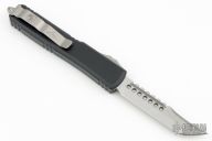 This Ultratech by Microtech Knives features a stonewashed Hellhound blade with satin flats and false top edge. The handle has a black aluminum frame with tip down blasted stainless steel clip and hardware. Comes with original box and papers. 06/2022, S/N 378. Excellent condition.