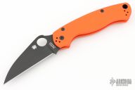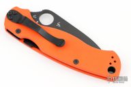 This Paramilitary 2 Liner lock Folder from Spyderco has a black finished wharncliffe blade with thumbhole and notched thumbrest. Handle has orange G-10 scales, nested stainless steel liners, black 4-way reversibel clip. Comes with original box and papers. New condition.