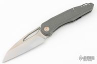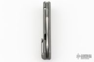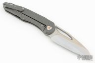 This Sigil NF by Deryk Munroe features a satin finished blade with thumb hole and notched thumbrest. The handle has a tumbled titanium frame with coffin scaled milling pattern, stainless steel pivot with bronze inlays, a titanium backspacer with bronze inlay, tip up titanium clip, and stainless steel lockface insert/internal overtravel stop. Nice detent, lockup and blade seating. Rides on bearings. Comes with original packaging, COA and band-aid. New condition.