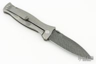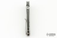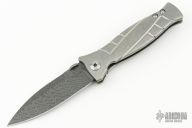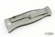 This MK3 by Les George features a Damascus blade with false top edge and knurled thumbdisc. The handle has a stonewashed titanium frame with Sweep pattern and a titanium tip up clip. Nice detent, lockup and blade seating. Comes with a zippered case. New condition.