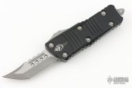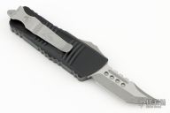 This Troodon Mini Hellhound OTF automatic by Microtech knives features an Apocalyptic finished single edged blade, and a black aluminum handle with bead blasted hardware, tip down carry. Glass breaker. S/N 124. Dated 03/2023. Comes with original box and papers. Excellent condition.